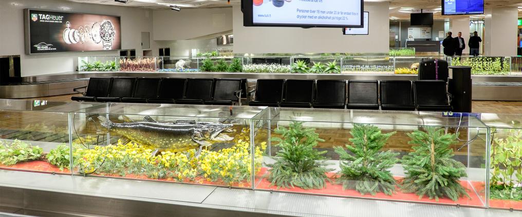 The main theme of the lobby is Finnish nature. Glass display cases placed among luggage lines present the flora and fauna of our home country.