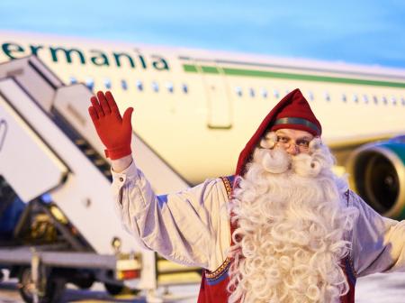 Santa watching as people are leaving a plane.