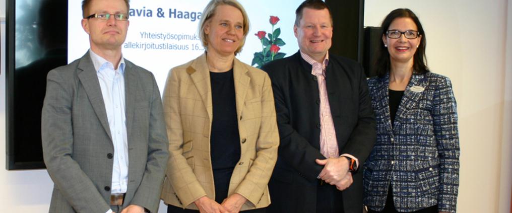 Kuvassa oikealta: Finavian HR Partner Sami Laine, Finavian henkilöstöjohtaja Kaarina Soikkanen, Haaga-Helian rehtori Teemu Kokko ja matkailun liikkeenjohdon koulutusohjelmajohtaja Minna Halmetoja.