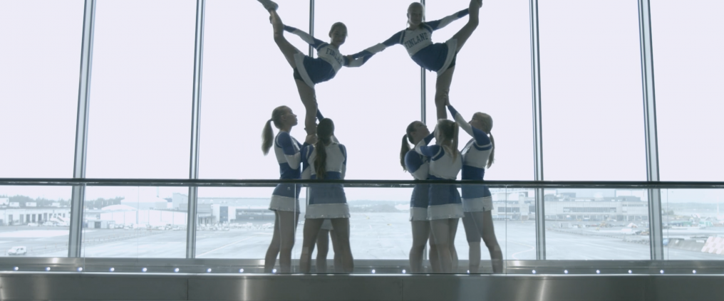 Rauhallinen aamupäivä Helsinki-Vantaan uudessa eteläsiivessa sai nostetta, kun odotushallin ilman valtasivat helsinkiläisen cheerleading-seura HAC:n edustusjoukkueen urheilijat.