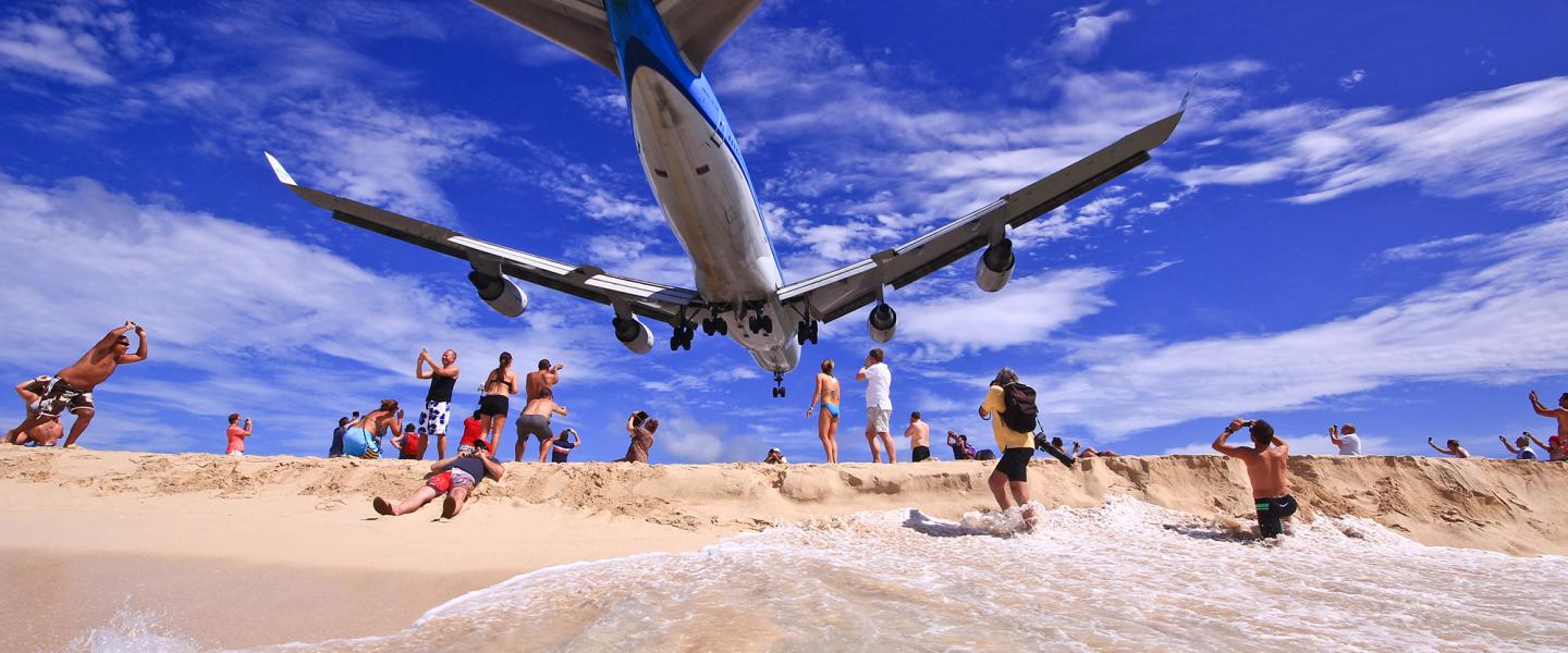 Sint Maartenin lentokentän kiitotie on yksi maailman vaativimmista. Onnistuneeseen laskuun ja nousuun vaaditaan lentäjältä erinomaista navigointia. Noustessa lentäjän pitää välttää edessä olevat vuoret ja laskeutuessa Maho-rannalla paistattelevat lomailijat. (Photo: Sxmairport)